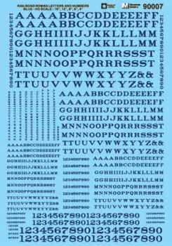 Description: (formerly 87-69-7) Alphabets - Railroad Roman - Blue - Waterslide Decal - HO Scale. Letters & Numbers are scaled to 4inch, 6inch. 8inch, 12inch & 16inch height