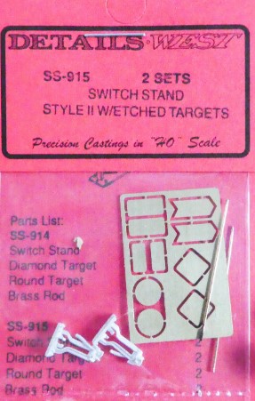 Details West HO Scale Switch Stands are based on those used on turnouts throughout North America. Available in several designs to match a variety of prototypes, each is a detailed, non-operating cast metal or plastic part. This Switch Stand is part of the complete line of Details West HO Scale track details.