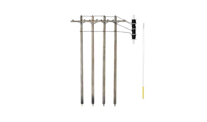 N Scale Utility System - Single-Crossbar Pre-Wired Poles Description: Place these N Scale Single Crossbar Pre-Wired Poles alongside railroad tracks to model telephone poles used for communication on the railroad! They are hand-painted and feature weathered wood poles, guy wires and other authentic details. Pre-Wired Poles can be installed in minutes! Simply drill holes, pull poles out of packaging, slide along wire and plant in place.