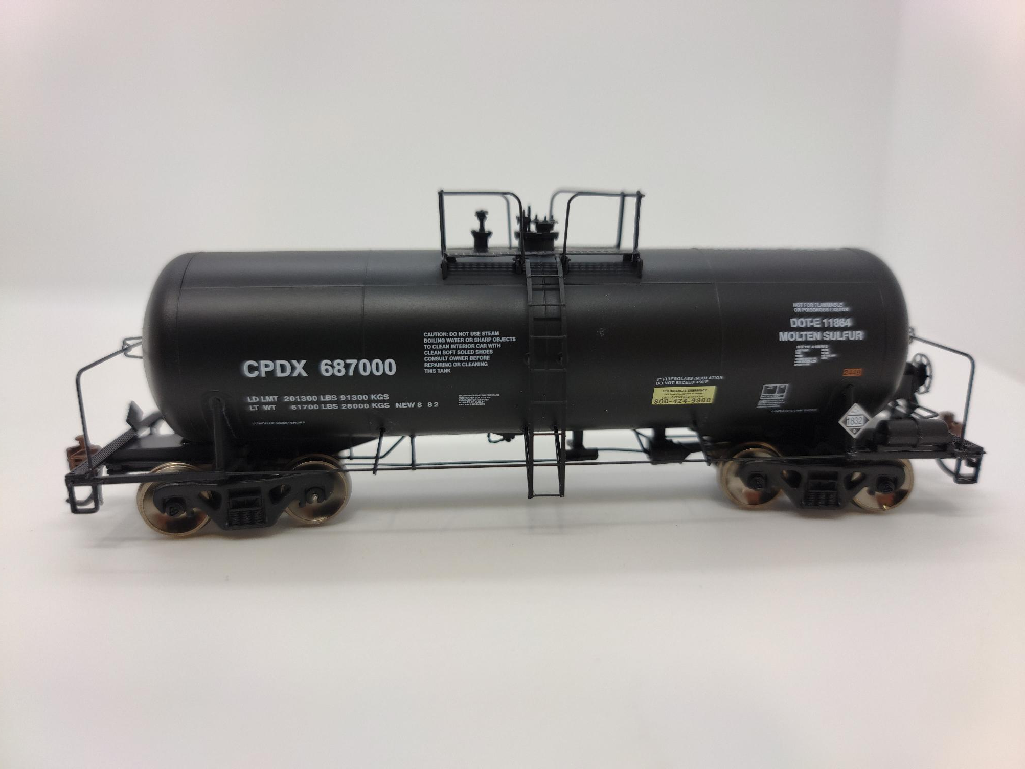 Athearn Genesis HO 13,600 Gallon Acid Tank Car, Chevron #687000 Athearn Item #: ATHG25646 MODEL FEATURES: Multiple road numbers, unique numbers between singles and 3-packs Two different body phases (early and late) Many separately applied details Etched metal walkways Different top platforms as appropriate per prototype Different brake systems as appropriate per prototype Separate wire grabs and handrails Different end sills as appropriate per prototype Trucks with animated rotating bearing caps Minimum radius: 18in Accurately painted and printed for prototypical realism Highly detailed, injection-molded body Coupler lift bars, trainline hoses, brake hoses, and hardware Body-mounted, McHenry (TM) scale double-shelf knuckle couplers Full underframe detail: air brake reservoir, control valve, and brake cylinder with plumbing and brake rod details Machined metal wheels with RP25 contours operate on all popular brands of track