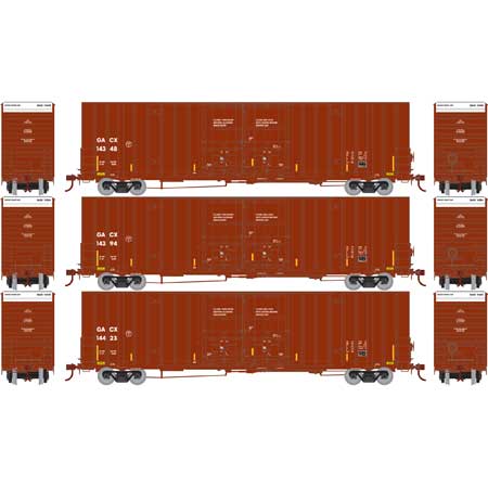 RTR 60Ft Gundreson Box Car - GACX (3-pkg) MODEL FEATURES: Fully assembled and ready for your layout Separately applied wire grab irons and etched end platforms Weighted for optimum performance Razor sharp painting and printing 36Inch metal wheels with RP25 contours operate on all popular brands of track Body mounted McHenry operating scale knuckle couplers Window packaging for easy viewing plus interior plastic blister safely holds the model for convenient storage Replacement parts available Minimum radius: 18Inch PROTOTYPE HISTORY: The modern 100 ton, high-cube, 60Ft boxcar has become ubiquitous in the modern rail scene. These cars are designed to carry a myriad of loads, from auto parts to forest products.These boxcars are a fixture to any modern freight train. The RTR model depicts accurately a Gunderson built boxcar. Many paint schemes from the extremely similar Trenton/Greenbrier built cars are also offered as close -stand-in- type models. Specifications PROTOTYPE MANUFACTURER: Gunderson COUPLER STYLE: McHenry Scale Knuckle ERA: 1990+