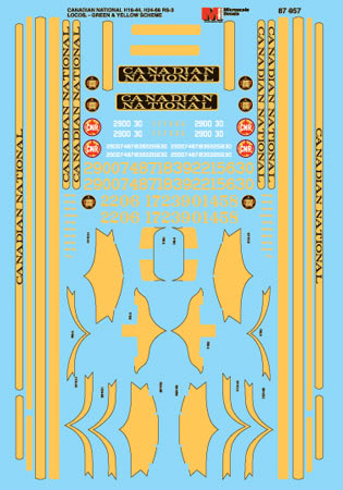 Canadian National waterslide decals for H16-44, H24-66 , RS-3, green & yellow Scheme diesels.