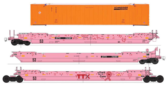 InterMountain 47371C-01 - HO Gunderson Maxi IV Late Well Car 3-Pack - Trailer Train - On Track for a Cure #732301 w Schneider Containers