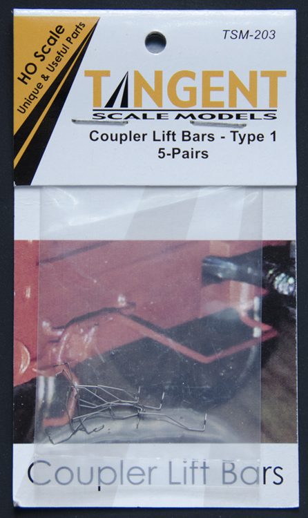 HO Scale - Coupler Lift Bars - Sharper Drop Angle - 5 Pairs This parts package includes five pairs of unpainted Tangent Scale Models hard wire coupler lift bars. While the shape of lift bars can change from car to car, these coupler lift bars are used on our ACF Gondola models and are potentially suitable for any model.