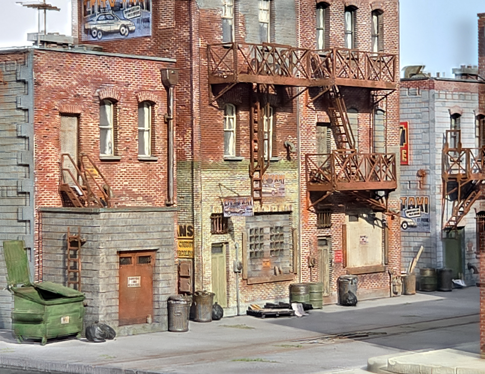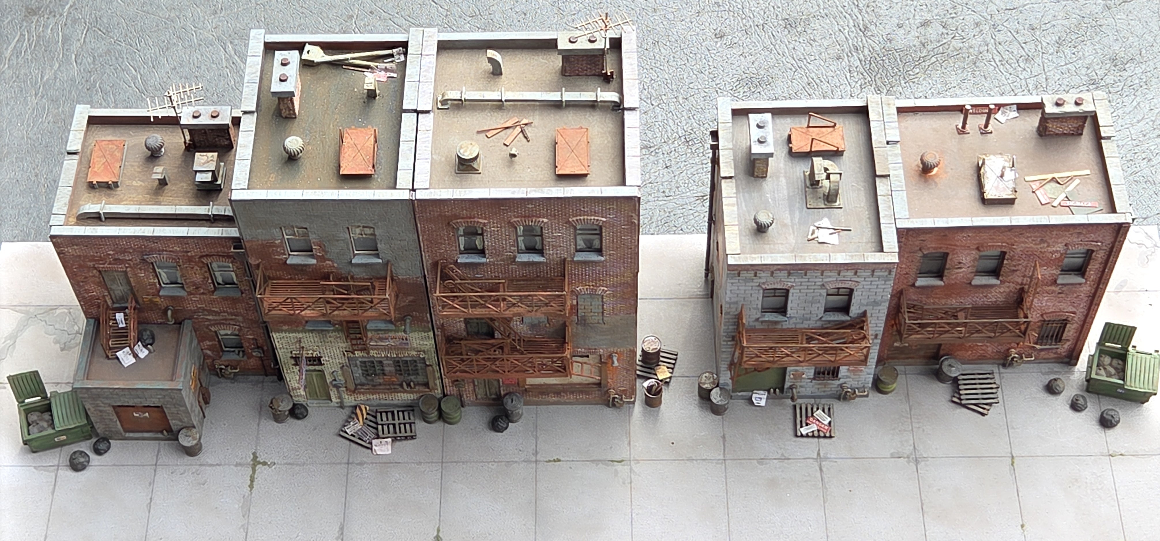 Five (5) modular buildings – Configurable - individual "backdrop" buildings with interchangeable side walls to fit your alley space. Even consider vertically offset on a slope!(rear walls are “blank”)